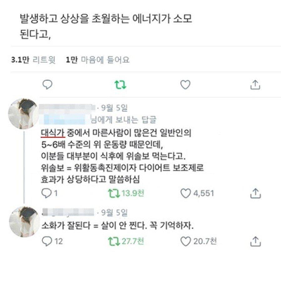 해당 트위터로 유명해진 만큼 다이어트 보조에 대한 확인이 필요해 보입니다.